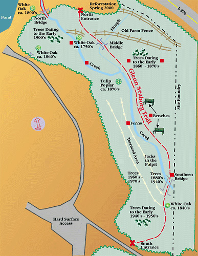 The map shows the Glenn Seaborg Trail and forest in relation to the site boundary to the east, the pond to the north, and Interstate 270 to the northeast. For a virtual walk on the Trail, mouse-over the red squares