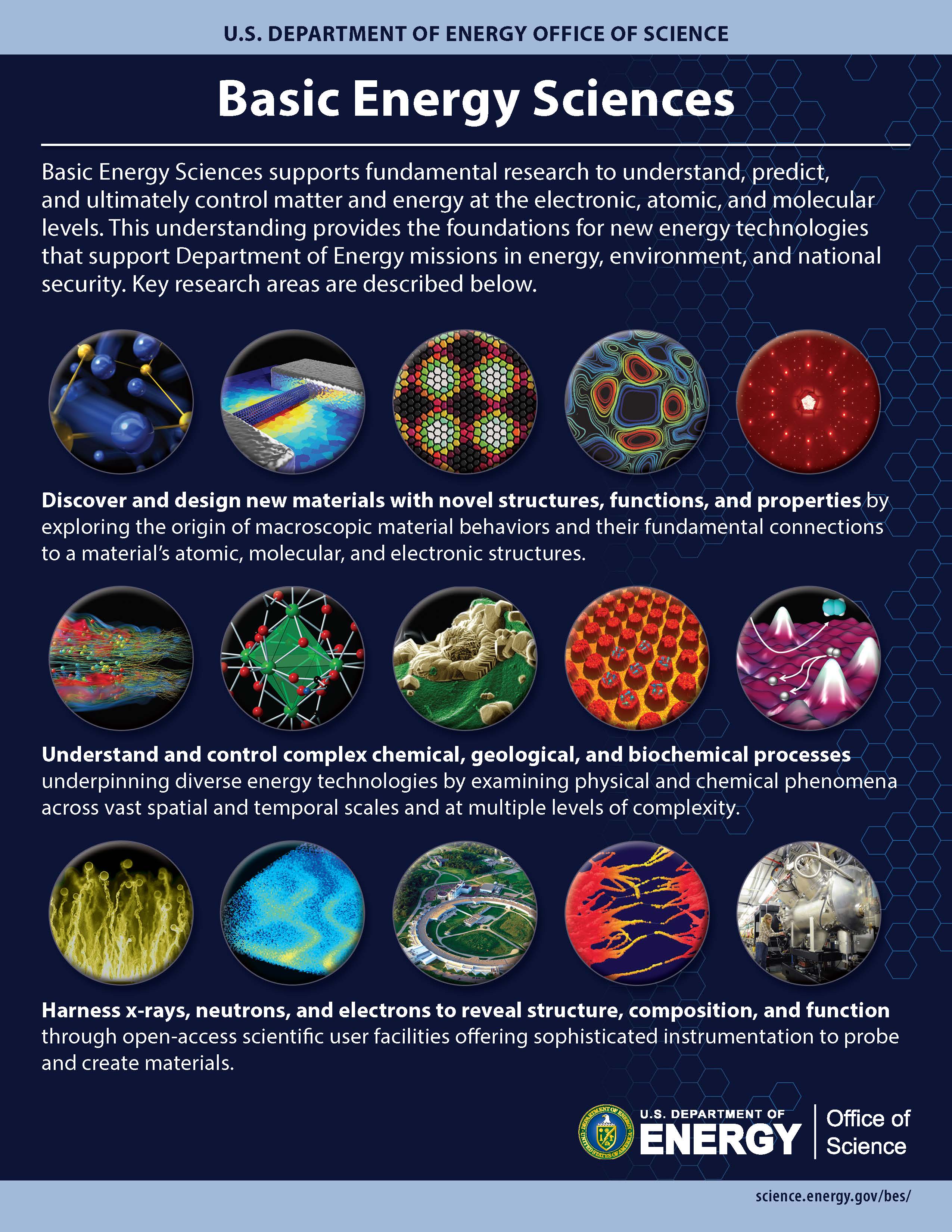 The Basic Energy Sciences (BES) informational brochures provide an overview of BES research areas, scientific user facilities, and the relevance of the research work to practical applications.