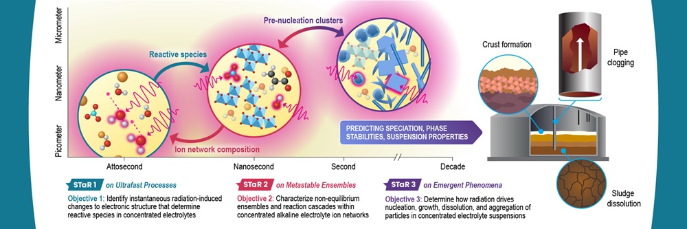 To master the cascade of radiation chemistry that drives far from equilibrium speciation and reactivity in chemically complex environments, linking attosecond timescales to decadal processes.
