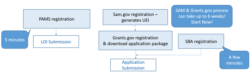 There are four system registrations required to submit an Applications, PAMS, SAM.gov, Grants.gov and SBA.gov. Registration instructions are in our FOA, and links to the systems and tutorials are included in the table below. Note that FedConnect and FSRS are required for awards, not for an application, and DUNS has been replaced by the Unique Entity Identifier (UEI), which is generated by SAM.gov.