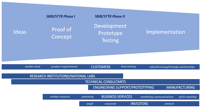 Partners play a critical role in transitioning advanced technologies from SBIR/STTR funded programs to the commercial market. Throughout technology development and productization you will engage with a myriad of partners filling many different roles and providing many different capabilities. The type of partners needed will vary as you move along the development path.