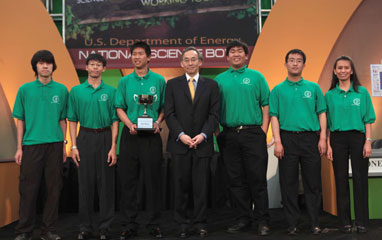 The Arcadia High School team poses with Secretary of Energy Steven Chu and their Fourth Place trophy at the 2010 National Science Bowl competition in Washington, DC on May 3, 2010.